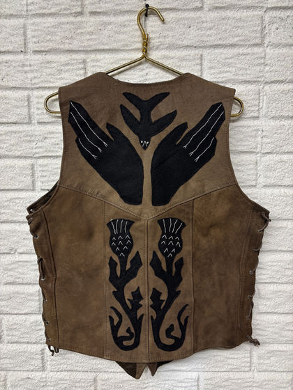 wool felt, cotton floss on thrifted leather jacket